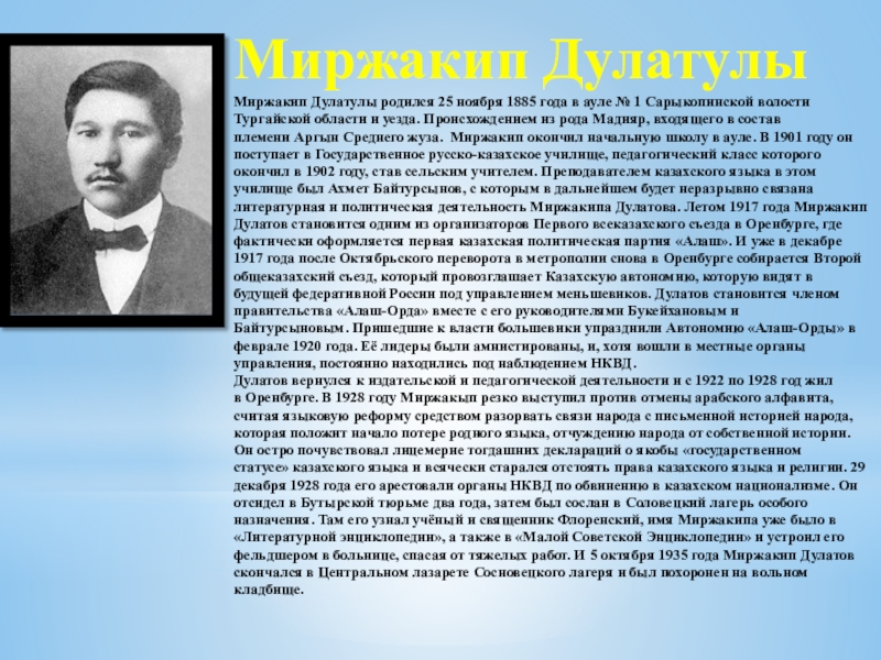 Миржакип Дулатулы родился 25 ноября 1885 года в ауле № 1