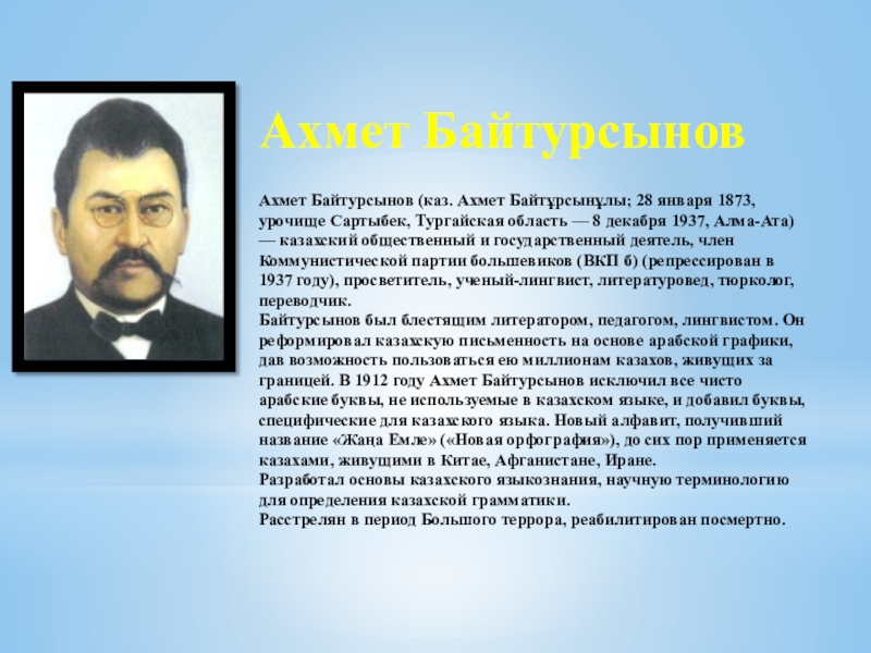 Ахмет Байтурсынов (каз. Ахмет Байтұрсынұлы; 28 января 1873, урочище Сартыбек, Тургайская