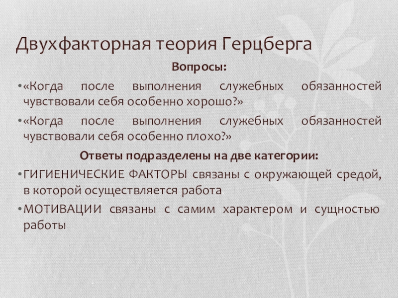 Двухфакторная теория ГерцбергаВопросы: «Когда после выполнения служебных обязанностей чувствовали себя особенно хорошо?» «Когда после выполнения служебных обязанностей