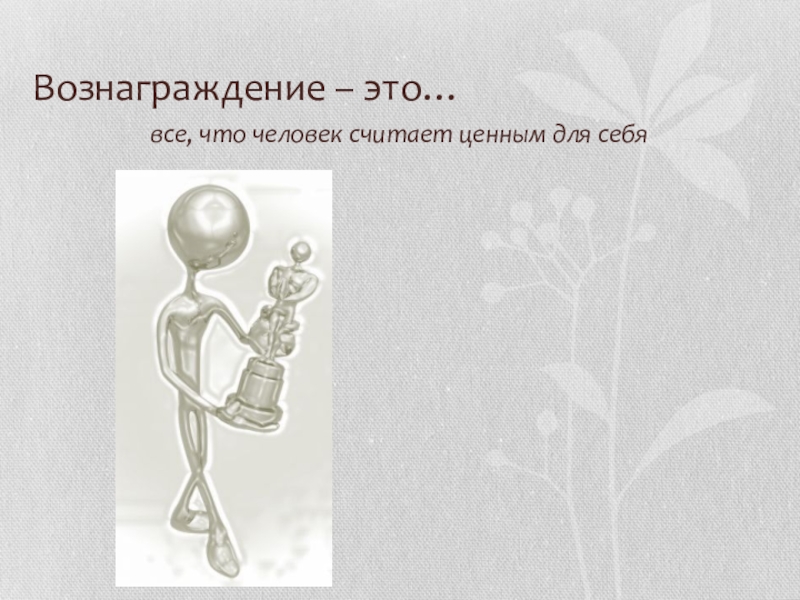 Вознаграждение может бытьВнутренним - чувство достижения результата, содержательности и значимости выполняемой работы, самоуважения и т. д.Внешним -