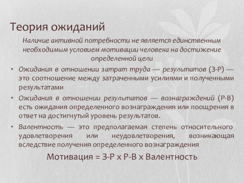 Теория ожиданийНаличие активной потребности не является единственным необходимым условием мотивации человека на достижение определенной целиОжидания в отношении