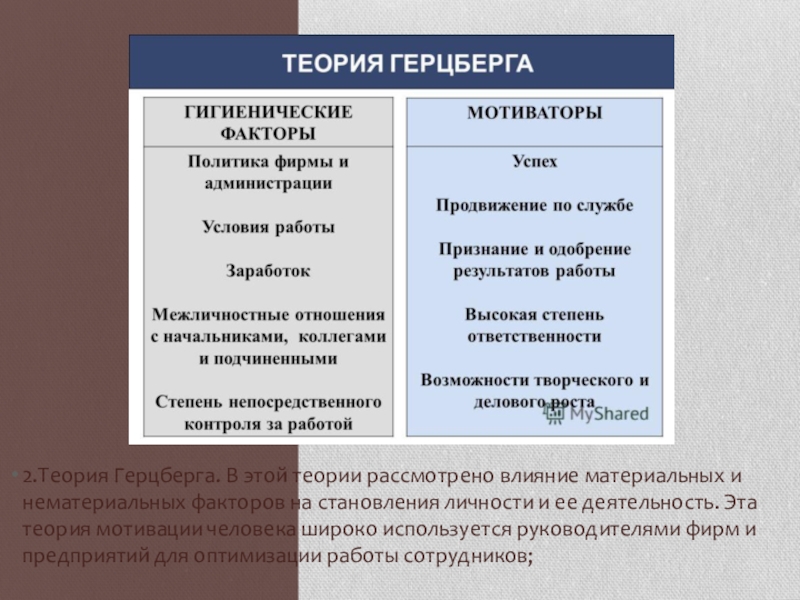 2.Теория Герцберга. В этой теории рассмотрено влияние материальных и нематериальных факторов на становления личности и ее деятельность.