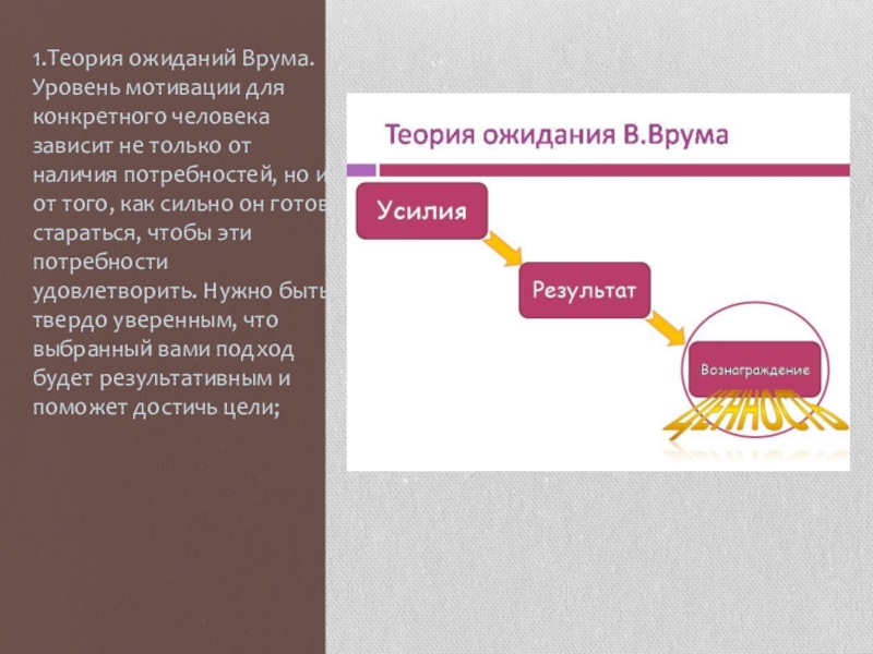 1.Теория ожиданий Врума. Уровень мотивации для конкретного человека зависит не только от наличия потребностей, но и от