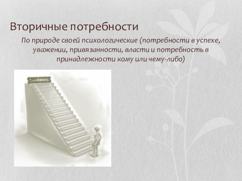Вторичные потребностиПо природе своей психологические (потребности в успехе, уважении, привязанности, власти и потребность в принадлежности кому или