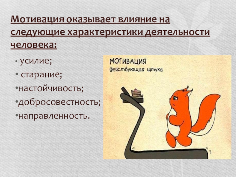 Мотивация оказывает влияние на следующие характеристики деятельности человека: усилие; старание;настойчивость;добросовестность;направленность.