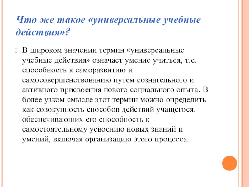 учебные действия» означает умение учиться, т.е. способность к саморазвитию и самосовершенствованию путем сознательного и активного присвоения нового социального опыта. В более узком смысле этот термин можно определить как совокупность способов действий учащегося, обеспечивающих его способность к самостоятельному усвоению новых знаний и умений, включая организацию этого процесса.