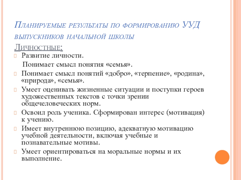 Слайд 9Планируемые результаты по формированию УУД выпускников начальной школы