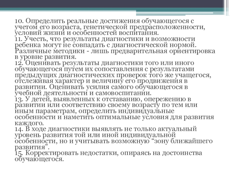 10. Определить реальные достижения обучающегося с учетом его возраста, генетической предрасположенности,