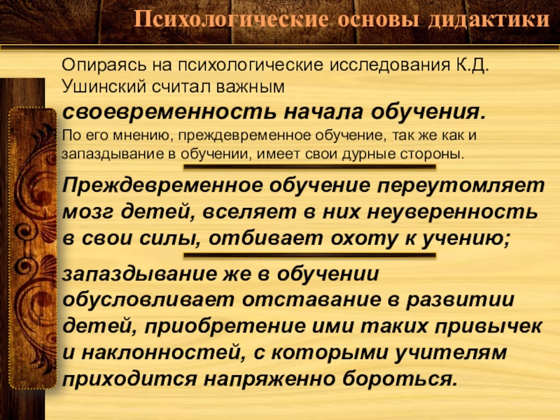 В своей дидактической системе К. Д. Ушинский отталкивался от психологической трактовки возрастных периодов развития ребёнка