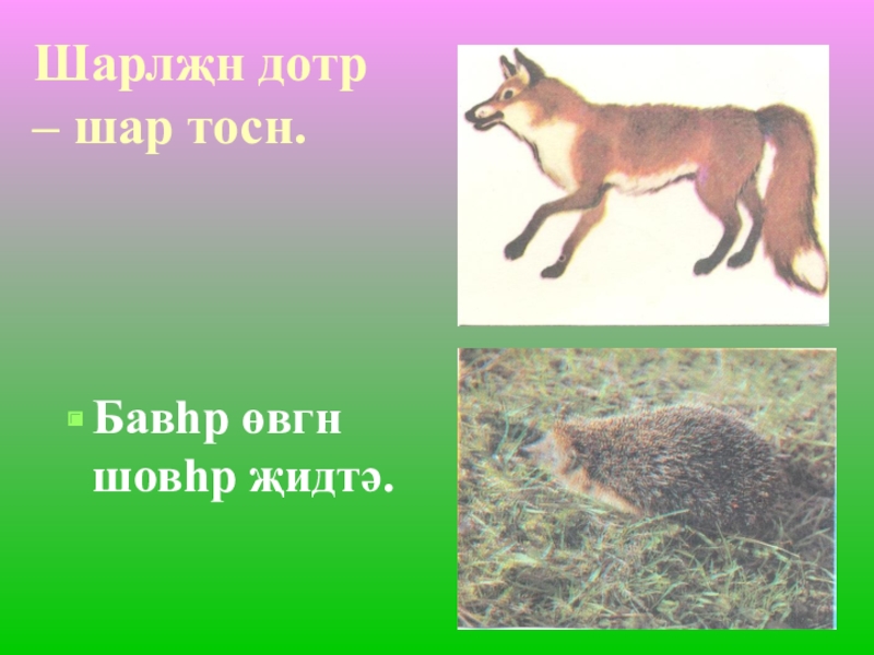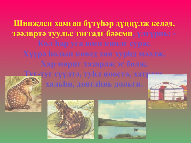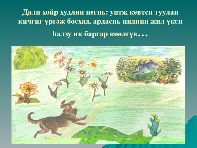 Слайд 12Далн хойр худлин негнь: унтҗ кевтсн туулан кичгиг үргəҗ босхад, ардаснь