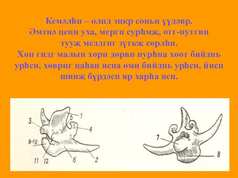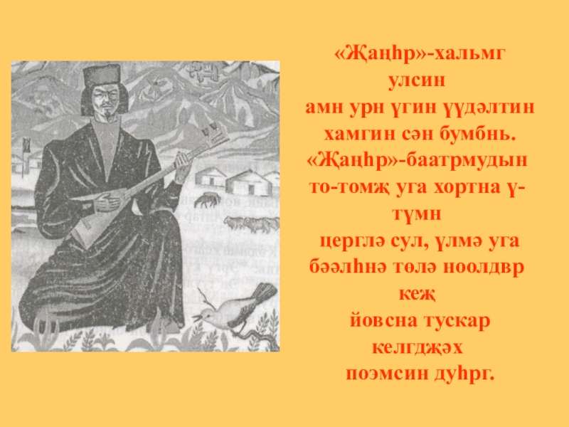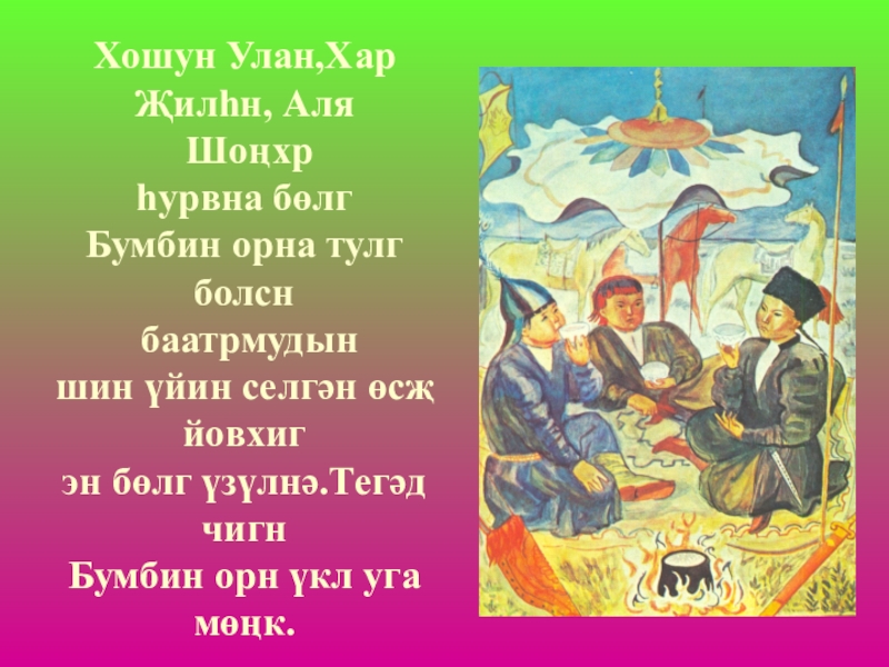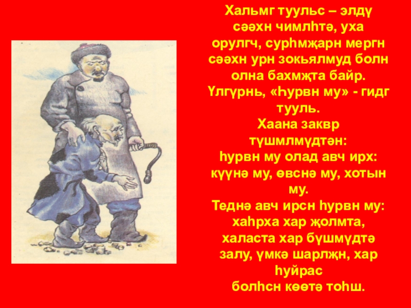 Слайд 13Хальмг туульс – элдү сəəхн чимлһтə, уха орулгч, сурһмҗарн мергн сəəхн