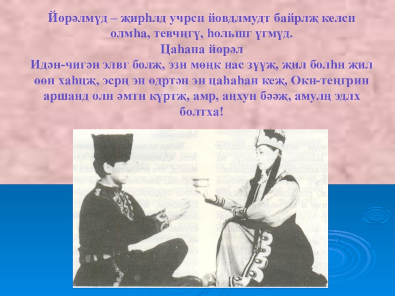 Идəн-чигəн элвг болҗ, эзн мөңк нас зүүҗ, җил болһн җил өөн хаһцҗ, эсрң эн өдртəн эн цаһаһан кеҗ, Окн-теңгрин аршанд олн əмтн күртҗ, амр, аңхун бəəҗ, амулң эдлх болтха!