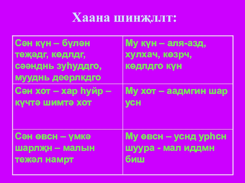 Слайд 6Шинҗлсн хамган бүтүһəр дүңцүлҗ келəд, тəəлвртə туульс тогтадг бəəсмн, үлгүрнь: -