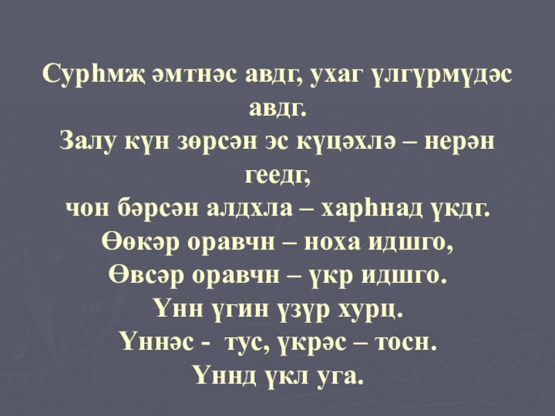 Дараһар далн хойр даранднь худл келҗ…даңһдл уга келəд, эрдмəн үзүлснднь күүкəн өгнəв болҗ…