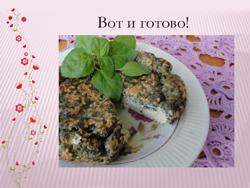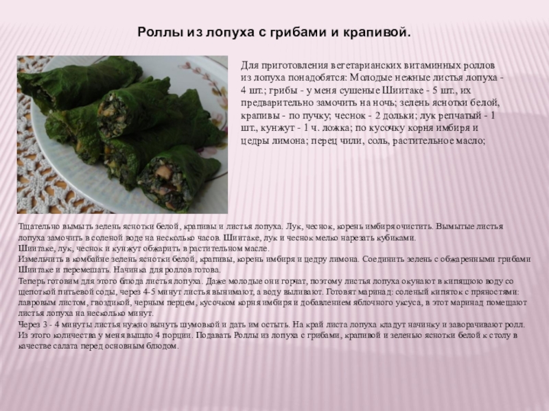 Через 3 - 4 минуты листья нужно вынуть шумовкой и дать им остыть. На край листа лопуха кладут начинку и заворачивают ролл. Из этого количества у меня вышло 4 порции. Подавать Роллы из лопуха с грибами, крапивой и зеленью яснотки белой к столу в качестве салата перед основным блюдом.