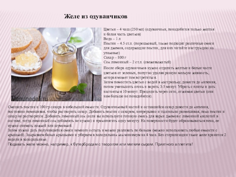 Смешать пектин и 100 гр сахара в небольшой емкости. Одуванчиковый настой и оставшийся сахар довести до кипения, постоянно помешивая, чтобы растворить сахар. Добавить пектин с сахаром, непрерывно и тщательно размешивая, пока пектин и сахар не растворятся. Добавить лимонный сок (если вы используете готовую смесь для варки джемов с лимонной кислотой в составе, тогда лимонный сок добавлять не нужно) и прокипятить одну минуту. На поверхности будет образовываться пена, ее нужно снимать ложкой или шумовкой.