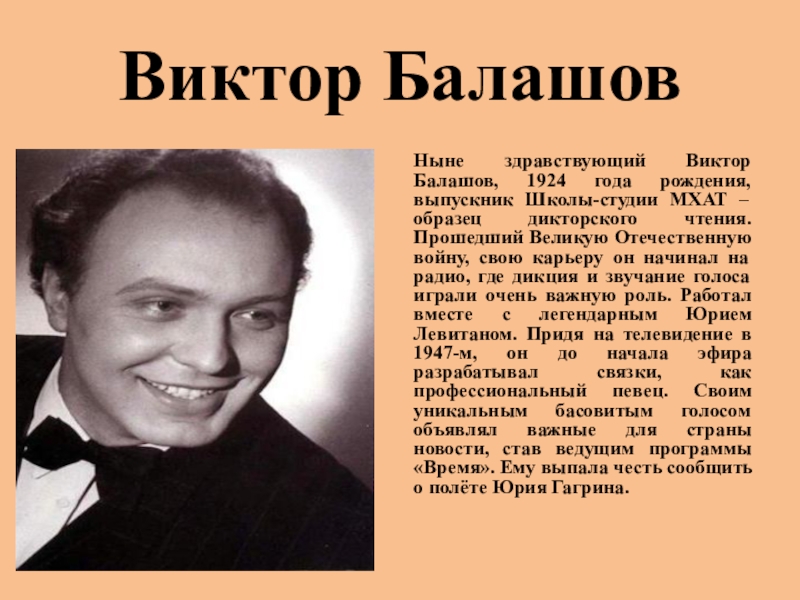 – образец дикторского чтения. Прошедший Великую Отечественную войну, свою карьеру он начинал на радио, где дикция и звучание голоса играли очень важную роль. Работал вместе с легендарным Юрием Левитаном. Придя на телевидение в 1947-м, он до начала эфира разрабатывал связки, как профессиональный певец. Своим уникальным басовитым голосом объявлял важные для страны новости, став ведущим программы «Время». Ему выпала честь сообщить о полёте Юрия Гагрина.