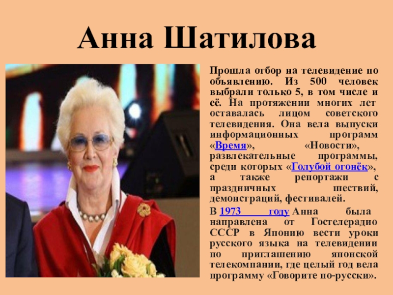 Знаменитый диктор советского телевидения. Одна из первых ведущих « Спокойной