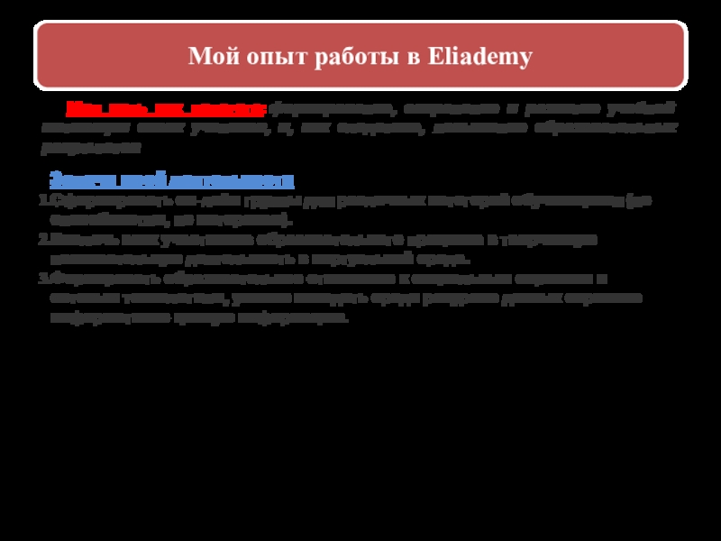 Мной был выбран образовательный сервис eliademy.com, который позволяет составлять образовательные курсы как педагогу, так и обучающимся, что дает возможность получить базовое образование, а также углубить обучение по дисциплине.
