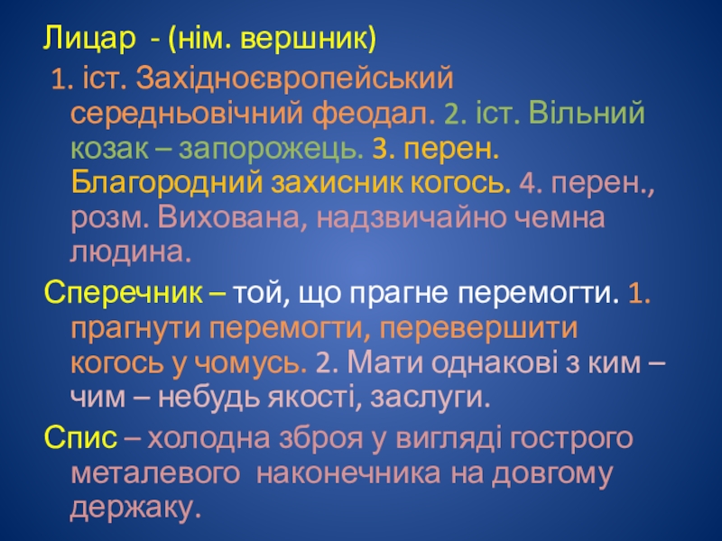 Вільний козак – запорожець. 3. перен. Благородний захисник когось. 4. перен., розм. Вихована, надзвичайно чемна людина.