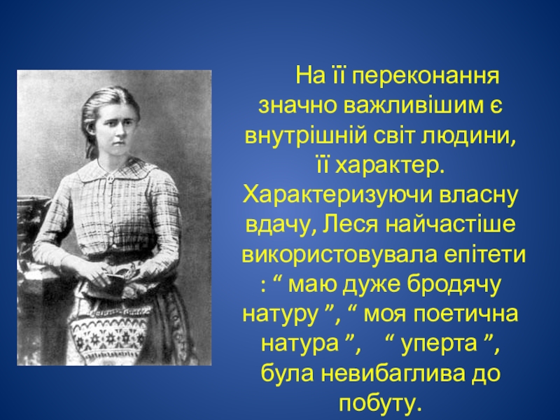внутрішній світ людини, її характер. Характеризуючи власну вдачу, Леся найчастіше використовувала епітети : “ маю дуже бродячу натуру ”, “ моя поетична натура ”, “ уперта ”, була невибаглива до побуту.