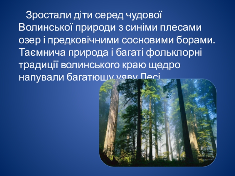 озер і предковічними сосновими борами. Таємнича природа і багаті фольклорні традиції волинського краю щедро напували багатющу уяву Лесі.