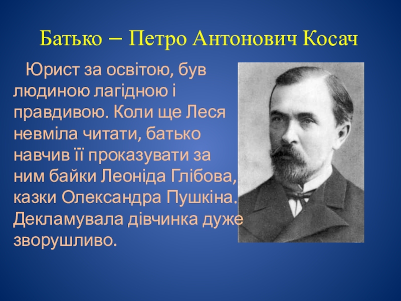 лагідною і правдивою. Коли ще Леся невміла читати, батько навчив її проказувати за ним байки Леоніда Глібова, казки Олександра Пушкіна. Декламувала дівчинка дуже зворушливо.