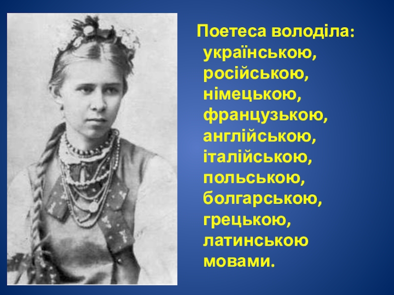 Слайд 18 Поетеса володіла: українською, російською, німецькою, французькою,