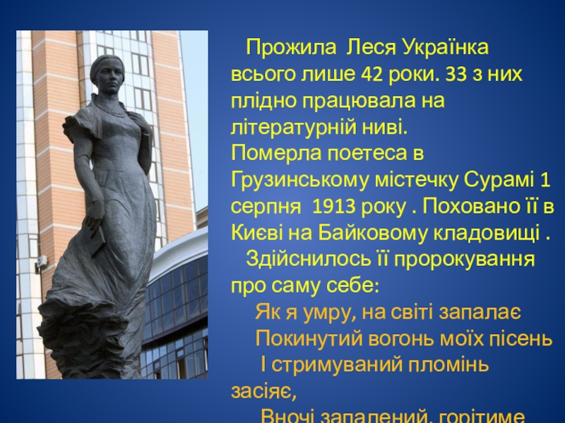 Слайд 24 Прожила Леся Українка всього лише 42 роки. 33 з