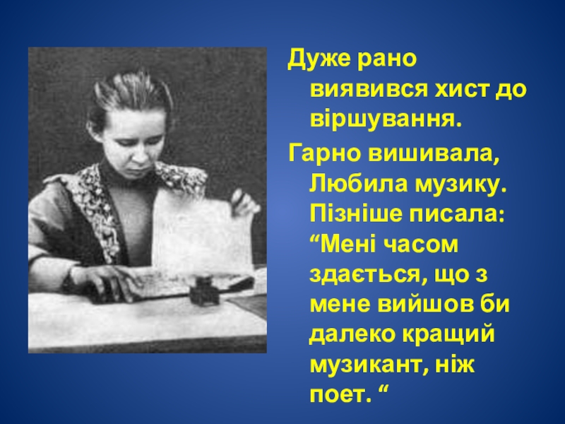Слайд 19 Любила музику і грала на фортепіано, виявляла інтерес до