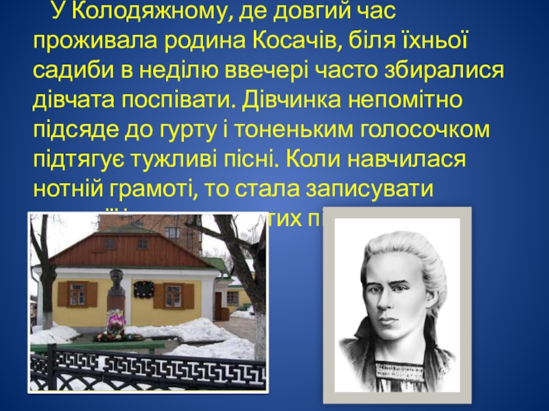 Слайд 14 У Колодяжному, де довгий час проживала родина Косачів, біля