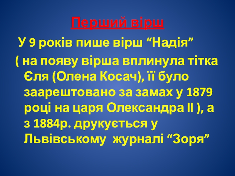 появу вірша вплинула тітка Єля (Олена Косач), її було заарештовано за замах у 1879 році на царя Олександра ll ), а з 1884р. друкується у Львівському журналі “Зоря”