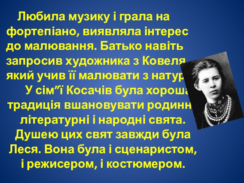 У сім”ї Косачів була хороша традиція вшановувати родинні, літературні і народні свята. Душею цих свят завжди була Леся. Вона була і сценаристом, і режисером, і костюмером.