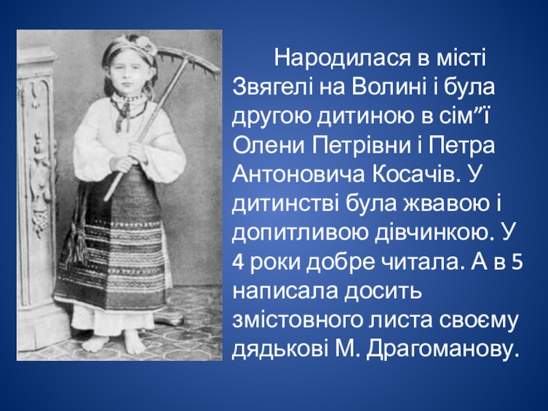 Народилася в місті Звягелі на Волині і була другою дитиною в сім”ї Олени Петрівни і Петра Антоновича Косачів. У дитинстві була жвавою і допитливою дівчинкою. У 4 роки добре читала. А в 5 написала досить змістовного листа своєму дядькові М. Драгоманову.