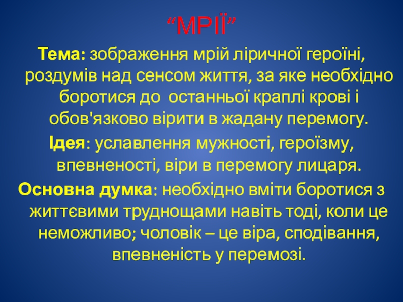 Тема: зображення мрій ліричної героїні, роздумів над сенсом життя, за яке