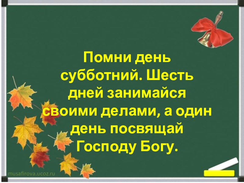 Слайд 4Помни день субботний. Шесть дней занимайся своими делами, а один день