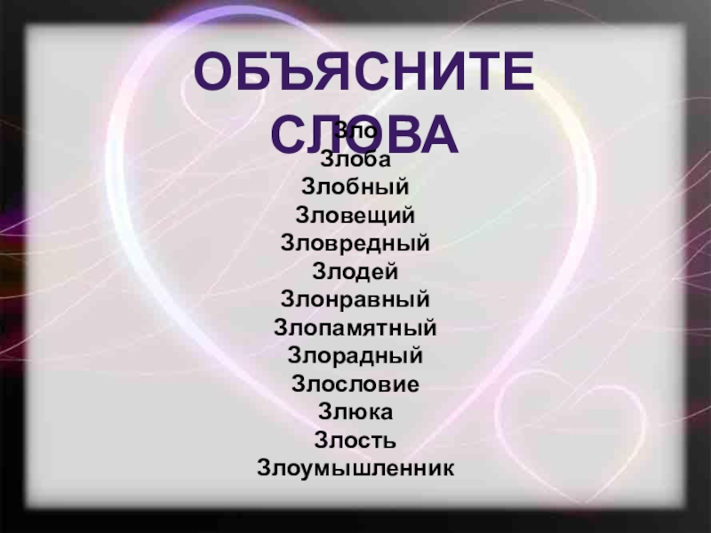 Объясните словаЗлоЗлобаЗлобныйЗловещийЗловредныйЗлодейЗлонравныйЗлопамятныйЗлорадный ЗлословиеЗлюкаЗлостьЗлоумышленник
