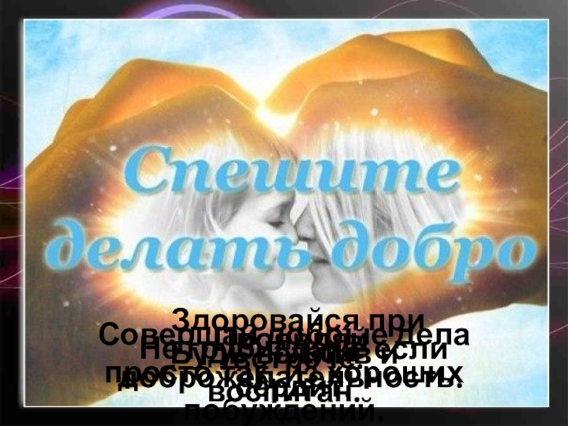 Здоровайся при встрече.Не груби, даже если сердит.Проявляй доброжелательность.Будь вежлив и воспитан.Совершай добрые дела просто так, из хороших