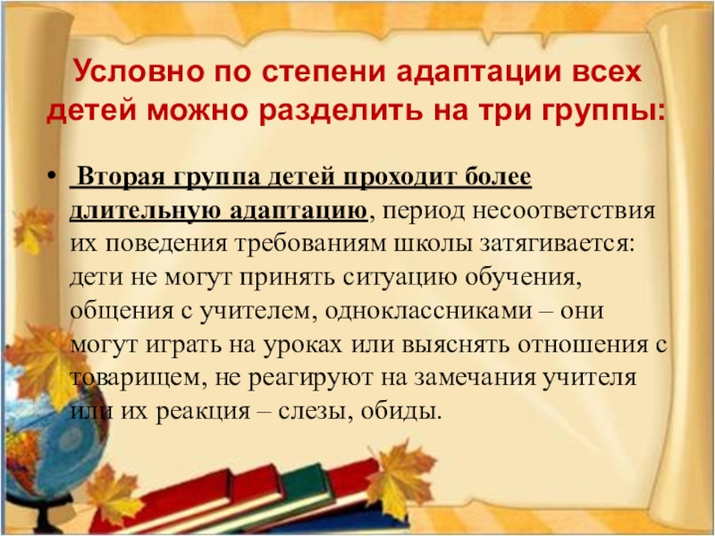 Вторая группа детей проходит более длительную адаптацию, период несоответствия их поведения требованиям школы затягивается: дети не могут принять ситуацию обучения, общения с учителем, одноклассниками – они могут играть на уроках или выяснять отношения с товарищем, не реагируют на замечания учителя или их реакция – слезы, обиды.