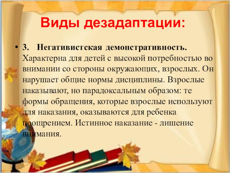 внимании со стороны окружающих, взрослых. Он нарушает общие нормы дисциплины. Взрослые наказывают, но парадоксальным образом: те формы обращения, которые взрослые используют для наказания, оказываются для ребенка поощрением. Истинное наказание - лишение внимания.