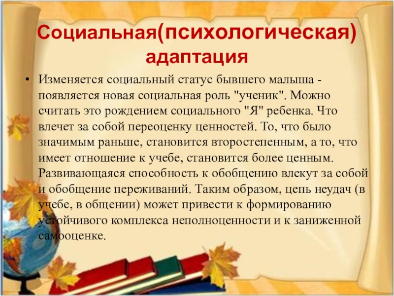 меняется социальное окружение(успешность адаптации зависит от отношения учителя, одноклассников, сверстников)