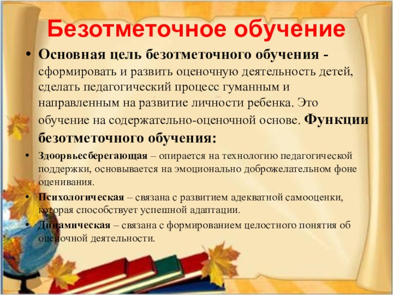 деятельность детей, сделать педагогический процесс гуманным и направленным на развитие личности ребенка. Это обучение на содержательно-оценочной основе. Функции безотметочного обучения:
