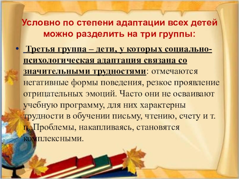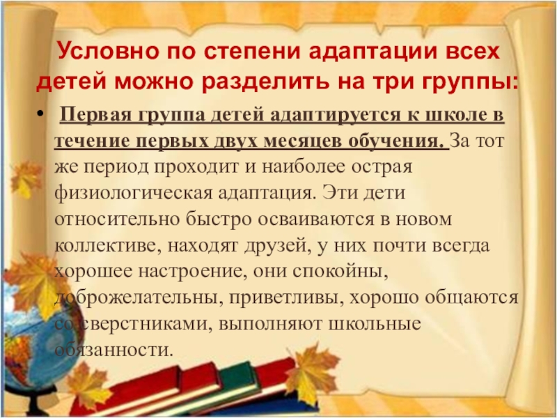 Слайд 10Условно по степени адаптации всех детей можно разделить на три группы: