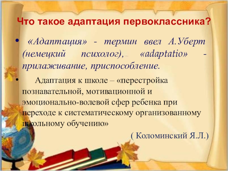 Адаптация к школе – «перестройка познавательной, мотивационной и эмоционально-волевой сфер ребенка при переходе к систематическому организованному школьному обучению»