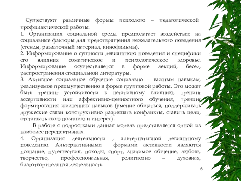 4. Организация деятельности , альтернативной девиантному поведению. Альтернативными формами активности являются познание, путешествия, походы, спорт, значимое общение, любовь, творчество, профессиональная, религиозно – духовная, благотворительная деятельность.