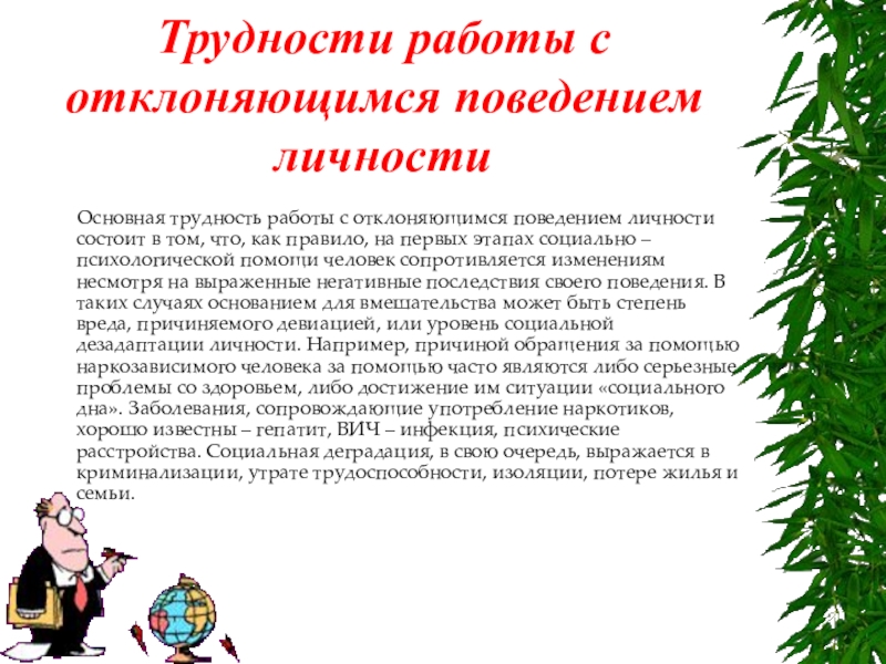 2. Информирование о сущности девиантного поведения и специфики его влияния соматическое и психологическое здоровье. Информирование осуществляется в форме лекций, бесед, распространения специальной литературы.