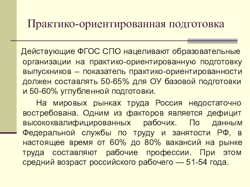 На мировых рынках труда Россия недостаточно востребована. Одним из факторов является дефицит высококвалифицированных рабочих. По данным Федеральной службы по труду и занятости РФ, в настоящее время от 60% до 80% вакансий на рынке труда составляют рабочие профессии. При этом средний возраст российского рабочего — 51-54 года.