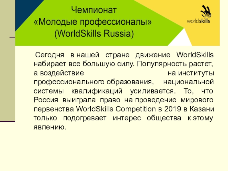 растет, а воздействие на институты профессионального образования, национальной системы квалификаций усиливается. То, что Россия выиграла право на проведение мирового первенства WorldSkills Competition в 2019 в Казани только подогревает интерес общества к этому явлению.