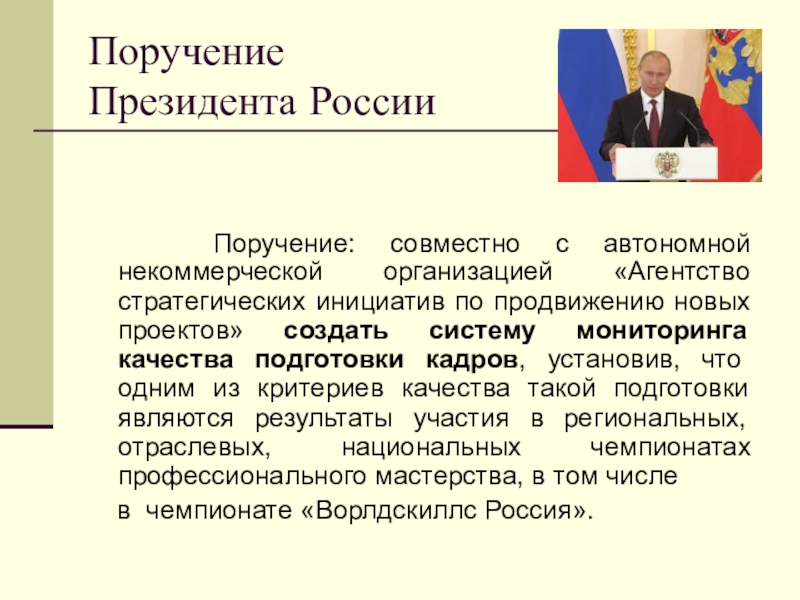 «Агентство стратегических инициатив по продвижению новых проектов» создать систему мониторинга качества подготовки кадров, установив, что одним из критериев качества такой подготовки являются результаты участия в региональных, отраслевых, национальных чемпионатах профессионального мастерства, в том числе