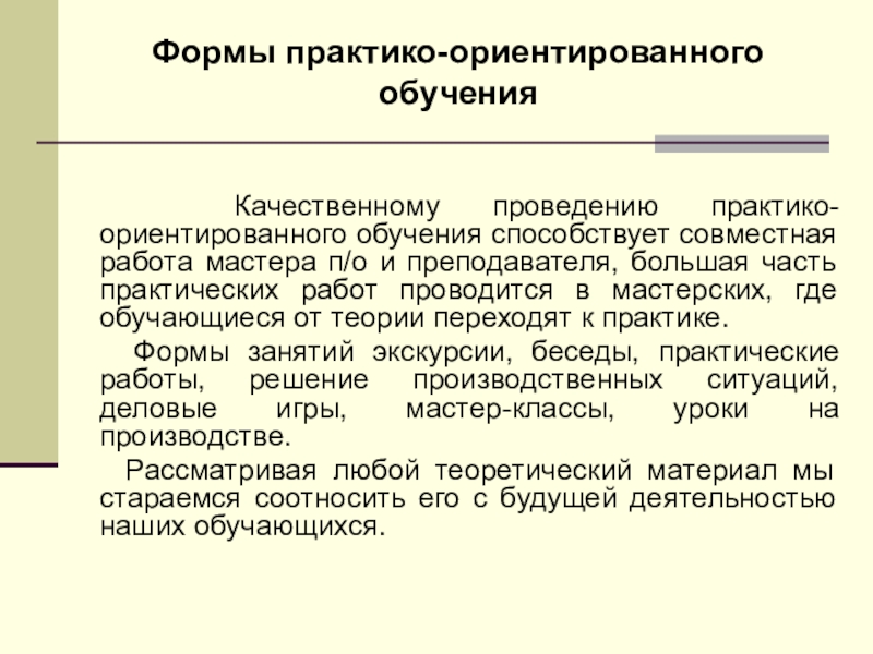 Формы занятий экскурсии, беседы, практические работы, решение производственных ситуаций, деловые игры, мастер-классы, уроки на производстве.